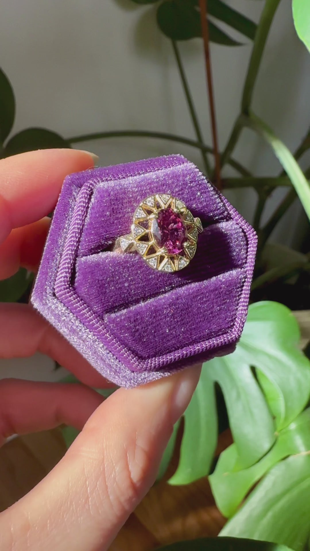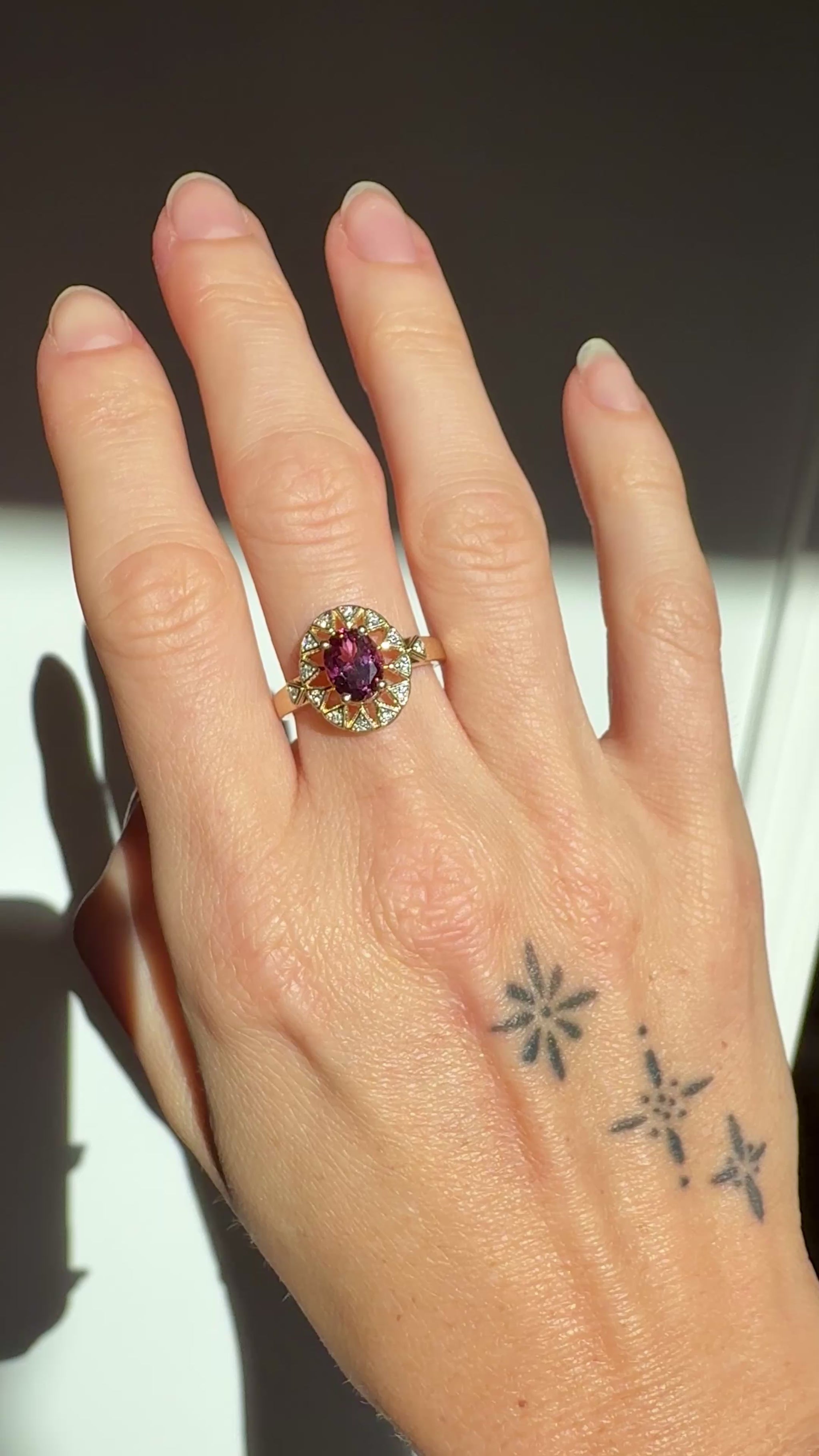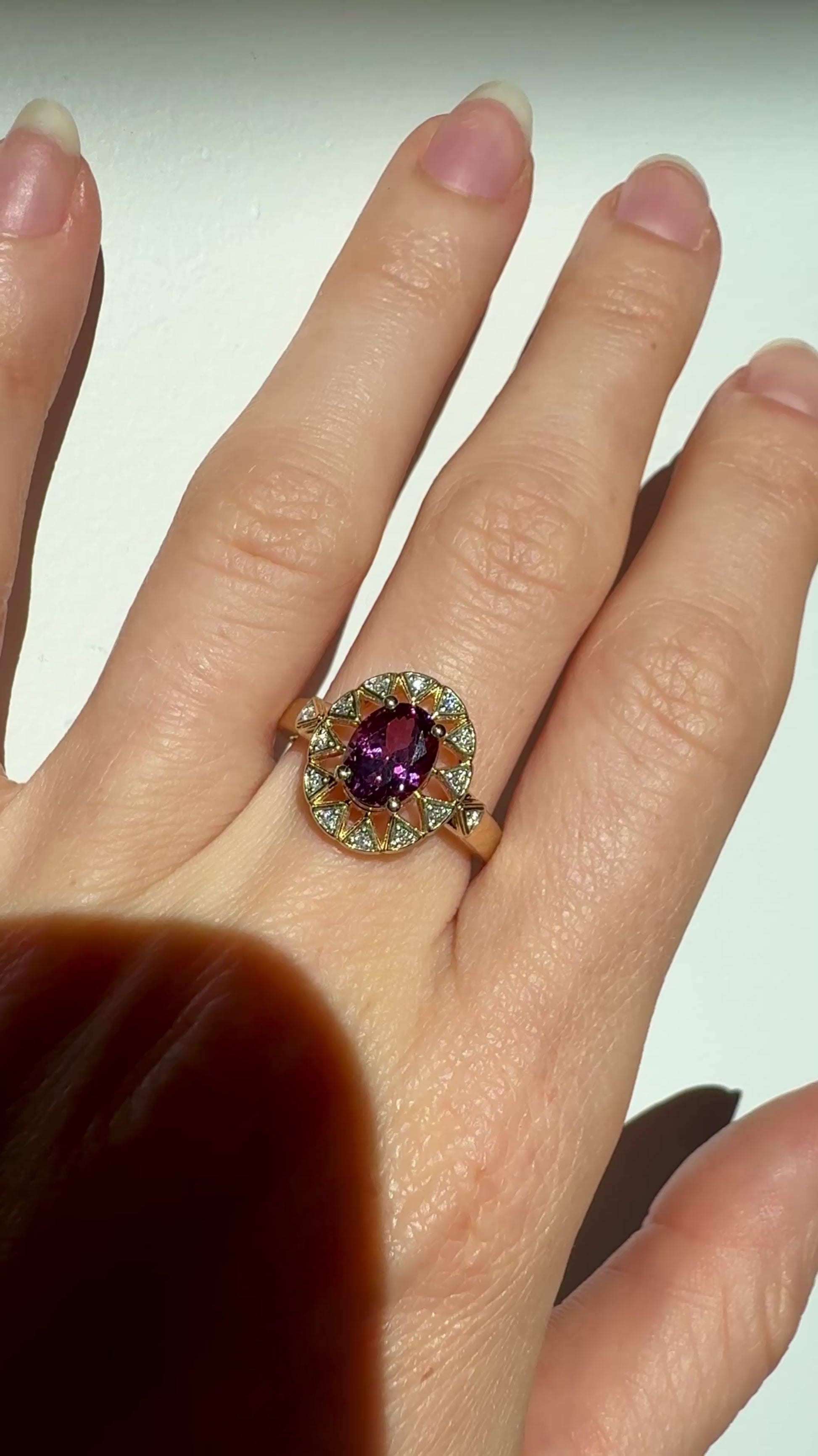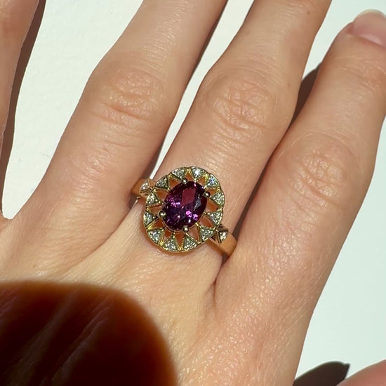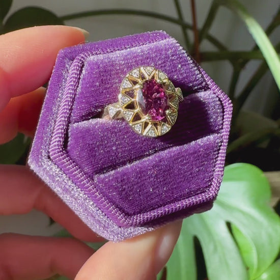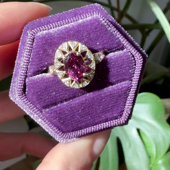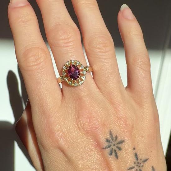 Presenting the Sunburst Ring designed by Gem du Jour, featuring a 1.45ct rare fuchsia pyrope garnet surrounded by natural melee diamonds all set in 10k solid gold. One of a kind!